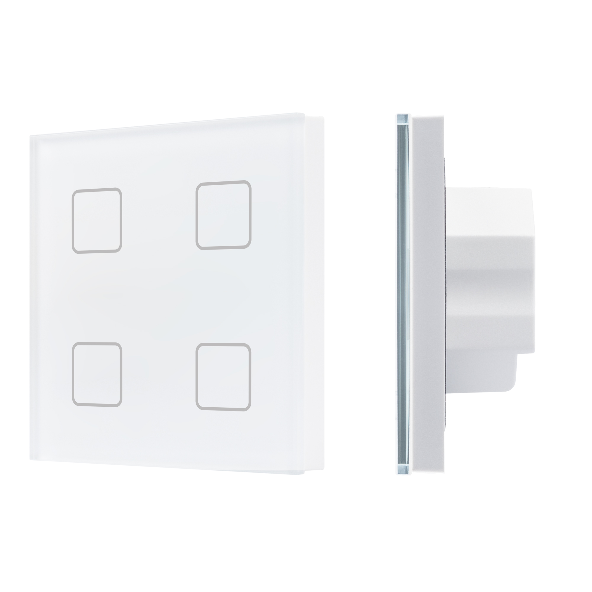 Встраиваемая стеклянная сенсорная панель DALI. Цвет - белый. 4 кнопки, управление 4 адресами DALI. Каждой кнопкой выполняется включение, выключение и диммирование по соответствующему ей адресу. Установка стартового адреса управления выполняется переключателями на корпусе. Питание 24VDC, либо по шине DALI. Подсветка кнопок, датчик приближения. Габариты 86x86x34.5 мм