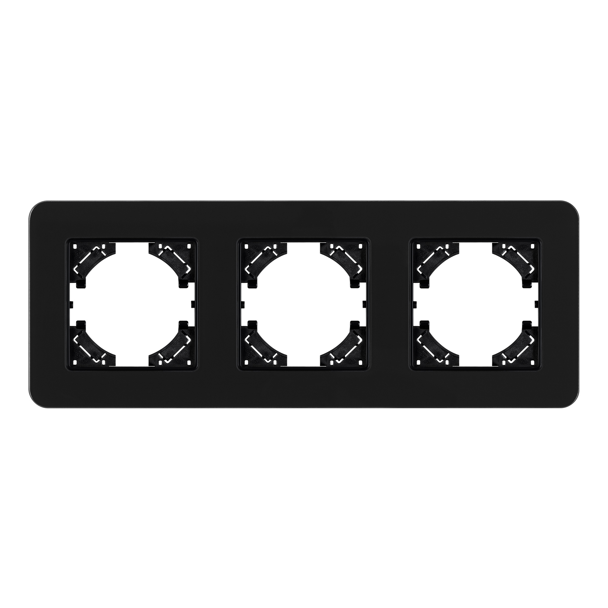 Рамка стеклянная на 3 поста, под встраиваемый механизм. Цвет - черный с Soft-Touch покрытием. Среднего уровня герметичности IP20. Ориентация монтажа - горизонтальная (основным ориентиром служат посадочные выступы для накладки механизма).