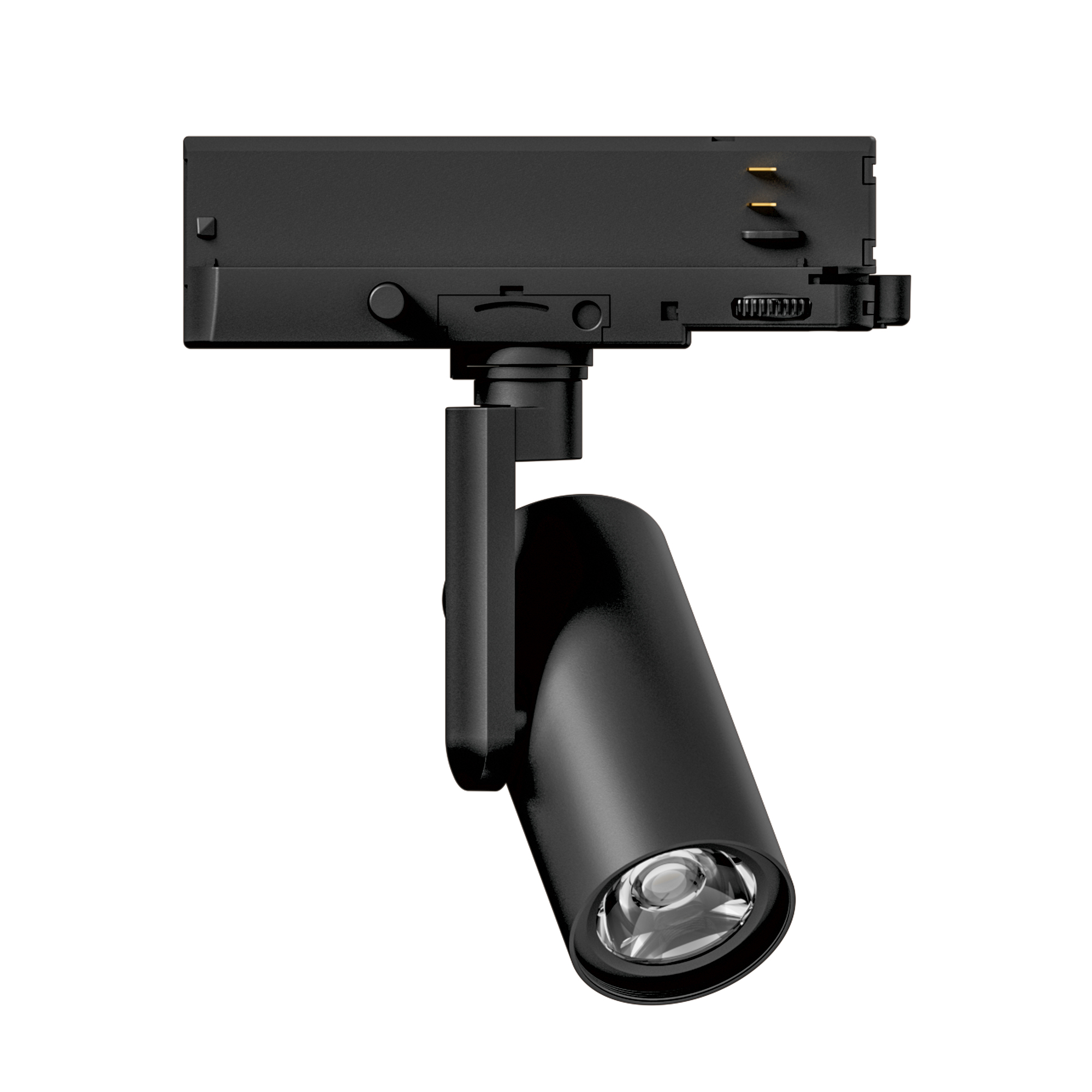 Светильник для треков/шин 4 провода, 18Вт. Управление и изменение цветовой температуры по протоколу DALI. Цвет свечения меняется в диапазоне 2700К - 4000К, световой поток при 2700К - 1120лм, при 4000К - 1300лм, 62лм/Вт, угол 20°, CRI>95. Корпус круглый, алюминий, цвет черный, IP20. Размеры Ø65x190x220 мм. Входное напряжение AC220-240V, мощность 18Вт. Драйвер встроенный (8-40В, 450мА), пульсация <0.3%